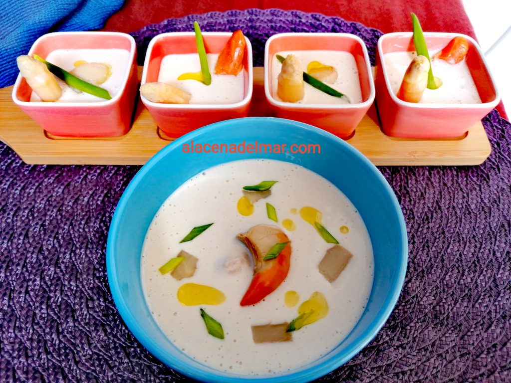 * Llenamos los vasitos o cuencos de ajo blanco bien frío, escurrimos nuestras vieiras del aceite y disponemos una en cada vaso. Decoramos con los tallos de cebolla tierna y unas yemas de espárragos blancos, rematamos con un chorro de aceite de oliva.