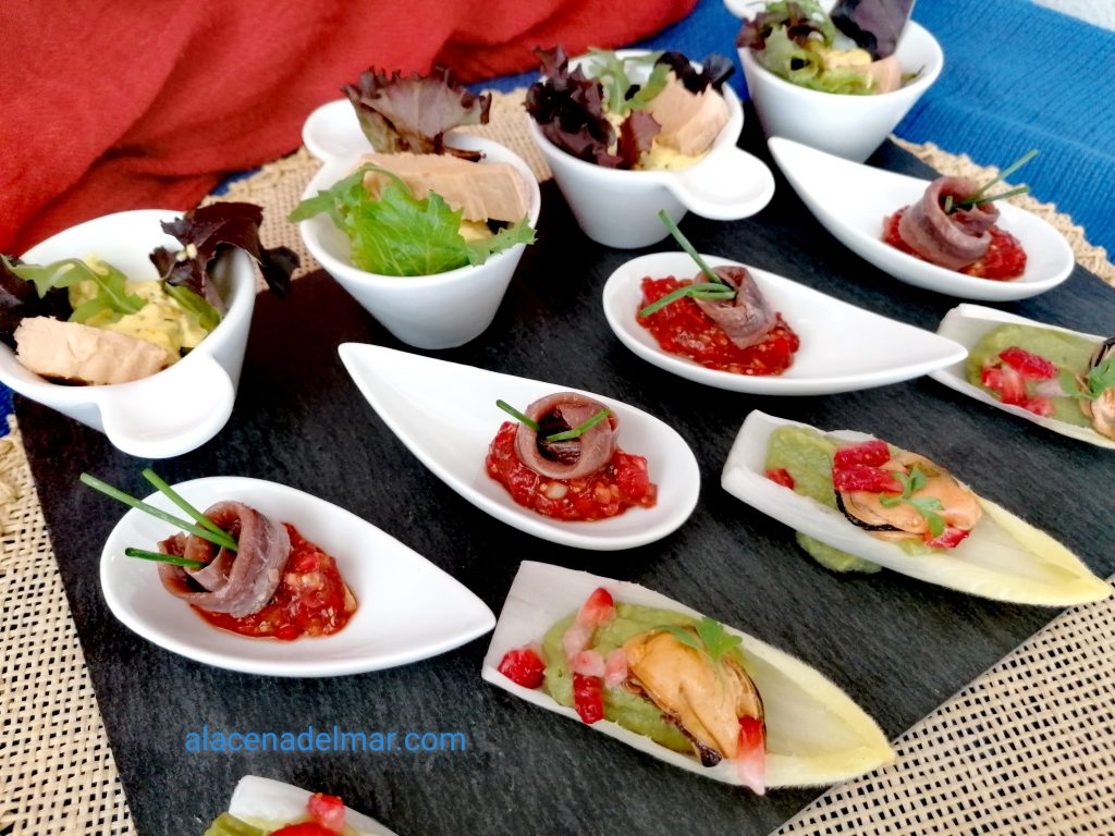Hoy una selección de tres de los más populares, anchoas, mejillones y bonito. Tres conservas que dan mucho juego y podemos presentarlos de mil maneras diferentes, para las elaboraciones de hoy no nos hemos complicado mucho la vida. Mejillones con guacamole, endibias y picadillo de fresas, una combinación clásica pero que siempre queda bien, sencillo, colorido , fresco y con mucho sabor.