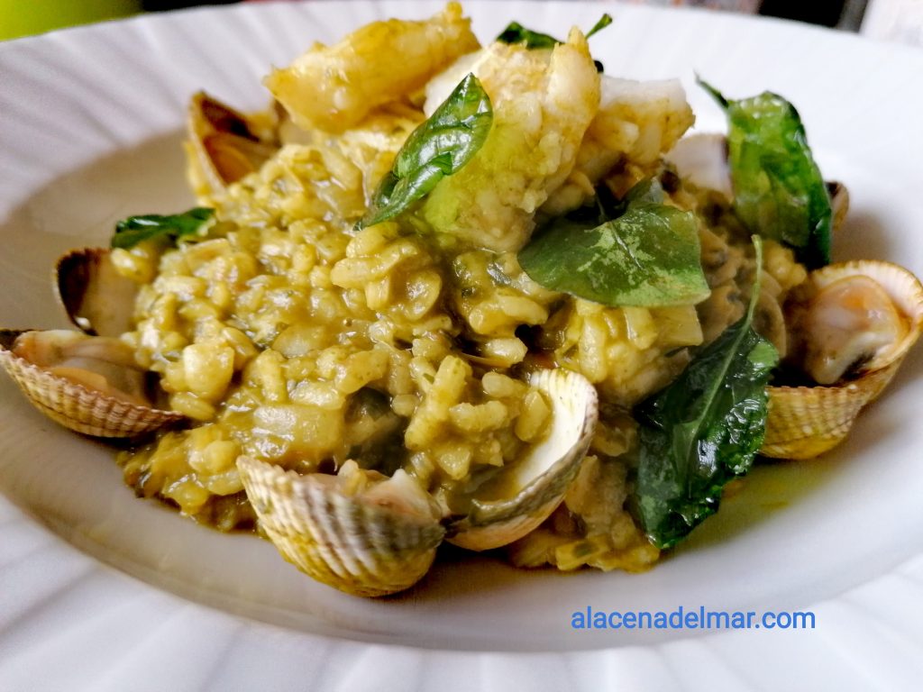 Arrocito delicioso, todo el sabor marinero con ese color verde que parece una pradera en primavera, solo faltan las vacas pastando. Una elaboración bien sencilla y rápida de hacer para que nuestros invitados se queden con ese delicioso sabor de boca que solo platos como éste pueden conseguir.