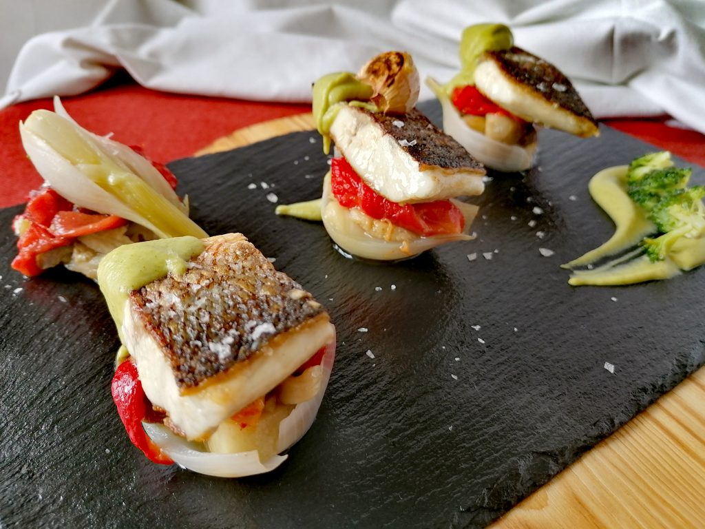 *Aprovechando que tenemos el horno caliente de las verduras introducimos la lubina después de marcada en la plancha un par de minutos para terminar de cocinarla y que nos quede con toda su jugosidad, si nos pasamos en el cocinado este es un pescado que quedará muy seco y nada apetecible, por eso es muy importante controlar los tiempos de marcado en plancha y horno.