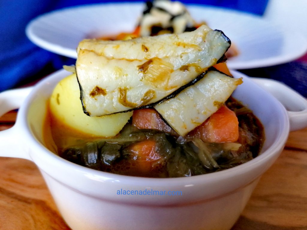 A disfrutar de estos ricos y saludables platos de cuchara, esta es una versión propia del afamado caldo gallego a base de productos del cerdo y legumbres, yo he prescindido de ambas, tratándose de un caldo marinero no me quedaba otra. El resultado de este ha sido maravilloso, un sabor y textura deliciosos, un colorido espectacular y un no parar de goce a la hora de degustarlo. Cada uno que se haga sus combinaciones de pescado y verduras pero sin prescindir de los grelos, sabor, sabor, sabor.