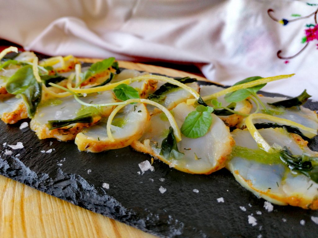 El emplatado lo haremos de manera sencilla colocando las rodajas de rape en el plato, decoramos con berros, unas pieles de limón blanqueadas, espolvoreamos sal en escamas y rematamos con un aceite de cebollino y ajo que haremos triturando AOVE, un manojo de cebollino y tres dientes de ajo pelados.