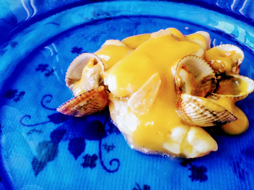 *Disponer las cocochas y los berberechos en el plato y salsear.