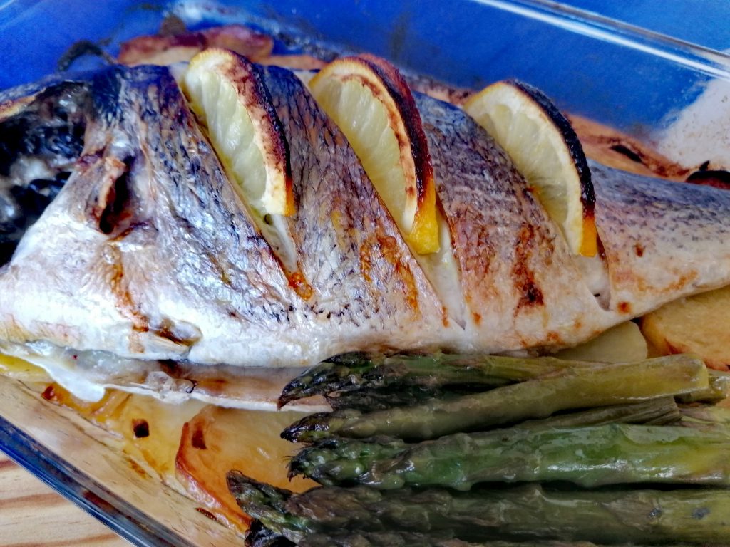 Estupenda dorada al horno con una clásica guarnición de patata panadera encebollada y espárragos trigueros también hechos al horno. Receta muy sencilla de elaborar, con la mínima manipulación y con todo su sabor. Por eso es muy importante que la dorada sea muy fresca ya que no la vamos a acompañar con guarniciones ni salsas que enmascaren su potente sabor a mar.