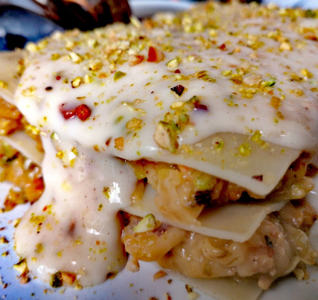 *Cubrimos con la bechamel bien caliente y espolvoreamos con el pidadillo de pistachos reservados. Llegados a este punto tenemos dos opciones, meterla en el horno con el grill encendido a 250°C para gratinarla durante 10 minutos aproximadamente o bien disfrutar de ella tal cual que es la que yo elegí.