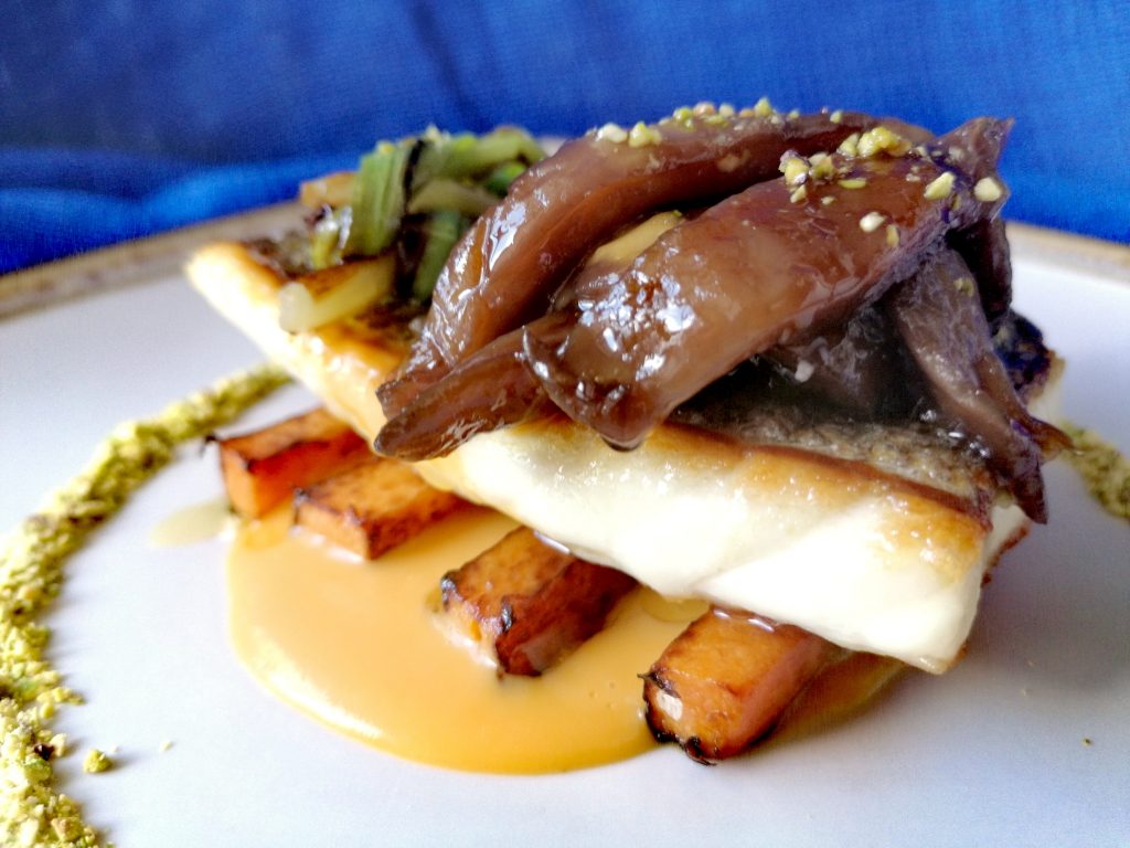 *Llega la hora del emplatado que siempre es la parte más divertida. Disponemos el puré en el plato, sobre él los bastones de calabaza y encima la lubina, decoramos con nuestras setas caramelizadas y los tallos de la cebolleta, opcionalmente espolvoreamos con cebollino picado o algún fruto seco, en este caso le puse unos pistachos picaditos que le dan un punto crujiente muy acertado.