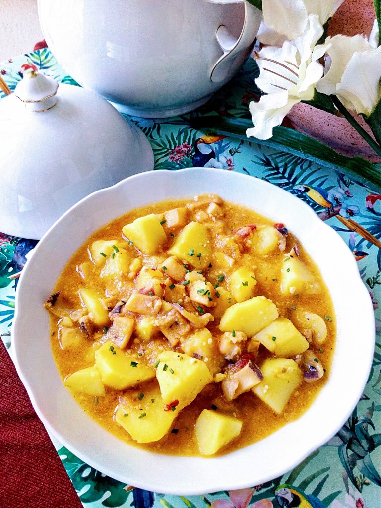 *En una sopera en el centro de la mesa, como lo hacen en Asturias, y que cada comensal se eche lo que le apetezca, con estas cantidades hay para repetir. En casa cuando hacemos este tipo de guisos es plato único y os aseguro que quedaréis satisfechos, ya sabemos que los platos de cuchara a la vez que nutritivos y saludables nos dejan sin ganas de segundo, como mucho un postre no muy contundente, o mejor unas piezas de fruta y nos quedaremos con esa sensación de haber comido sano para todo el día.