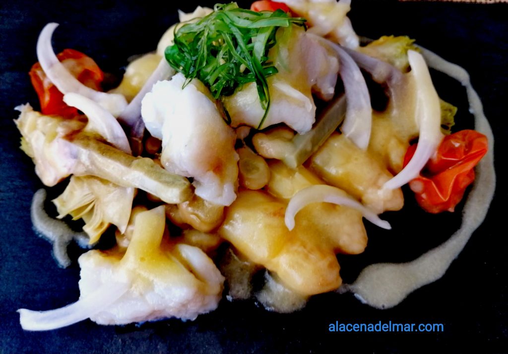 *Disponemos los espárragos en el plato, sobre ellos las habitas y las alcachofas, distribuimos los tomates cherry y los tacos de bacalao, aliñamos con la salsa pil pil, coronamos todo el conjunto con un manojito de algas y unas tiras de cebolleta en juliana.