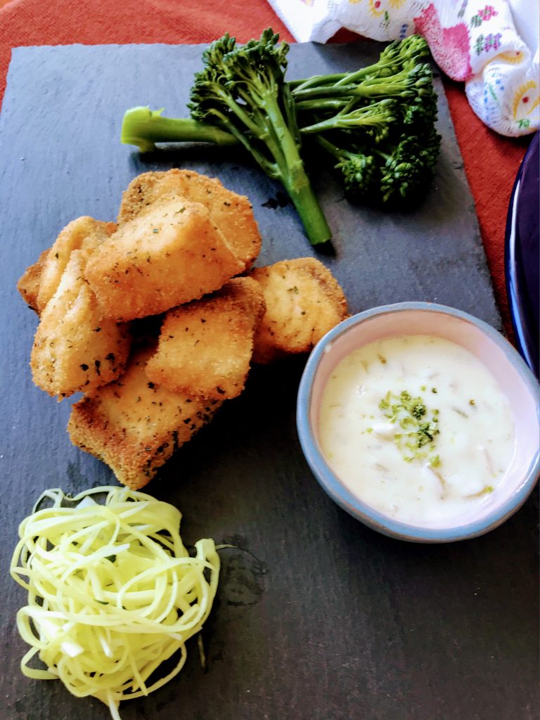 *Los cortamos en trozos regulares, como los Nuggets de pollo, salpimentamos e introducimos en la marinada para lo cual habremos juntado todos los ingredientes en un bol. Reservar en nevera un par de horas.