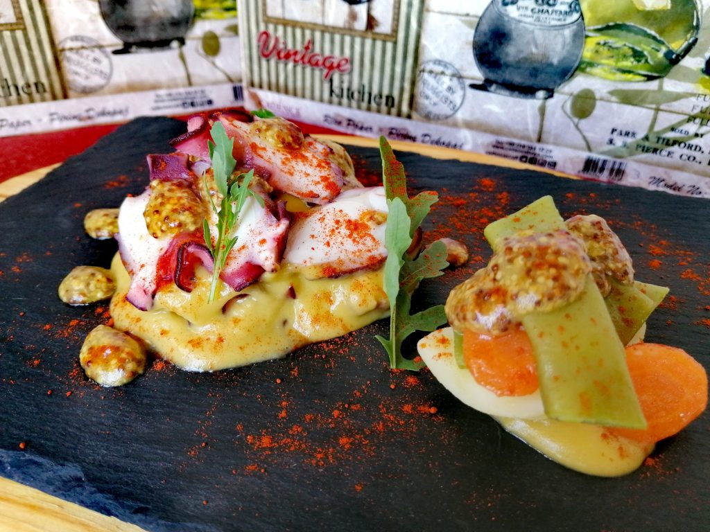 Pues otro plato muy sencillo pero vistoso, lleno de color y sobre todo con mucho sabor, una manera diferente de disfrutar del pulpo que combinado con nuestro cremoso y aceite de mostaza le da un toque muy original que no defraudará a nadie, animaros y a por el…