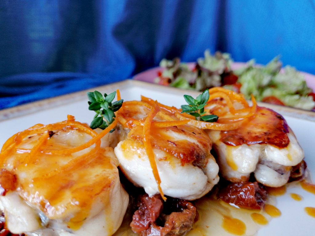 *Disponemos la guarnición de cebolla y tomate seco en el plato, sobre ella nuestro rape braseado y salseamos a nuestro gusto, decoramos con unas ramitas de tomillo y las tiras de naranja confitadas.