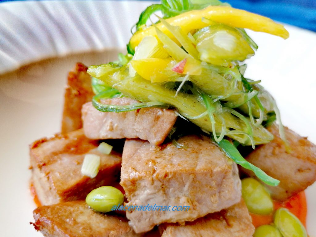 *Una vez salteada la soja verde incorporamos el mango y el wakame, le damos unas vueltas, sazonamos y añadimos un chorrito de vinagre. Reservamos tibia.