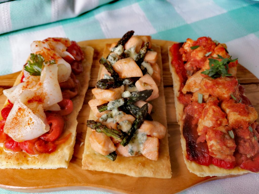 Día de cocas, en esta ocasión tres diferentes en formato mini y crujiente para comer a modo de aperitivo, elaboración que admite cualquier producto que se nos pueda ocurrir para tomar en frío o caliente. Hoy toca con bacalao ahumado, bonito fresco y salmón.
