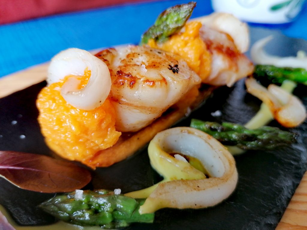 Quien puede resistirse a este delicioso aperitivo navideño?? Unas vieiras al grill muy bien arropadas con sus tallarines de sepia, su puré de trigueros y su calabaza. Todo sabores muy suaves para que predomine el dulzor y textura carnosa y delicada de las vieiras.